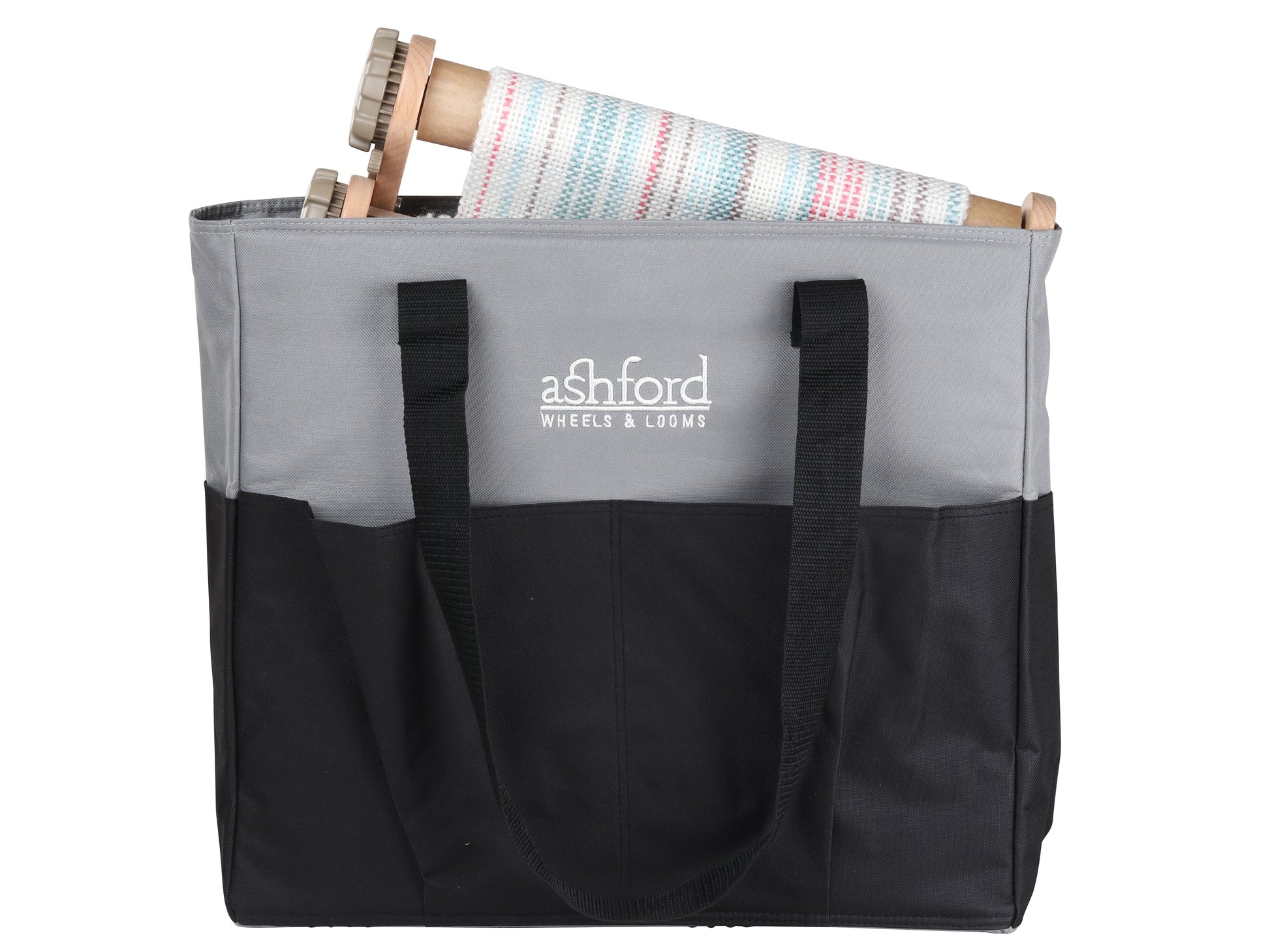 Baguettes de chaîne en carton, serres, livret d'apprentissage du tissage (en anglais), sac de transport rembourré, passette, cheville d'ourdissage |