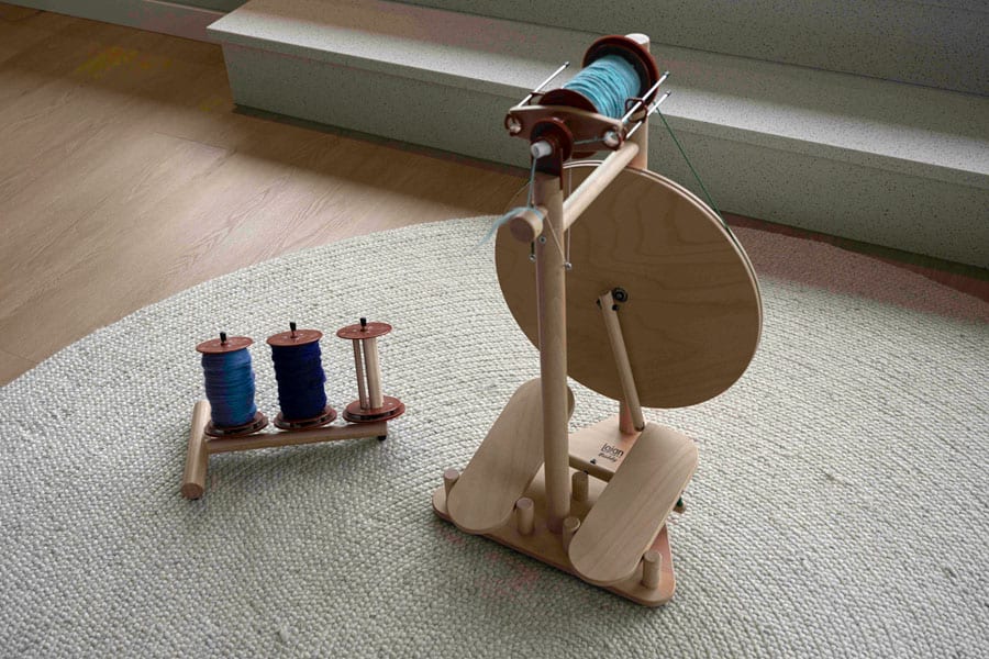 Le rouet Buddy vient avec quatre bobines et un cantre indépendant qui peut contenir trois bobines. Avec des bobine d'une capacité de 200g, vous serez capable de filer de grands projets.