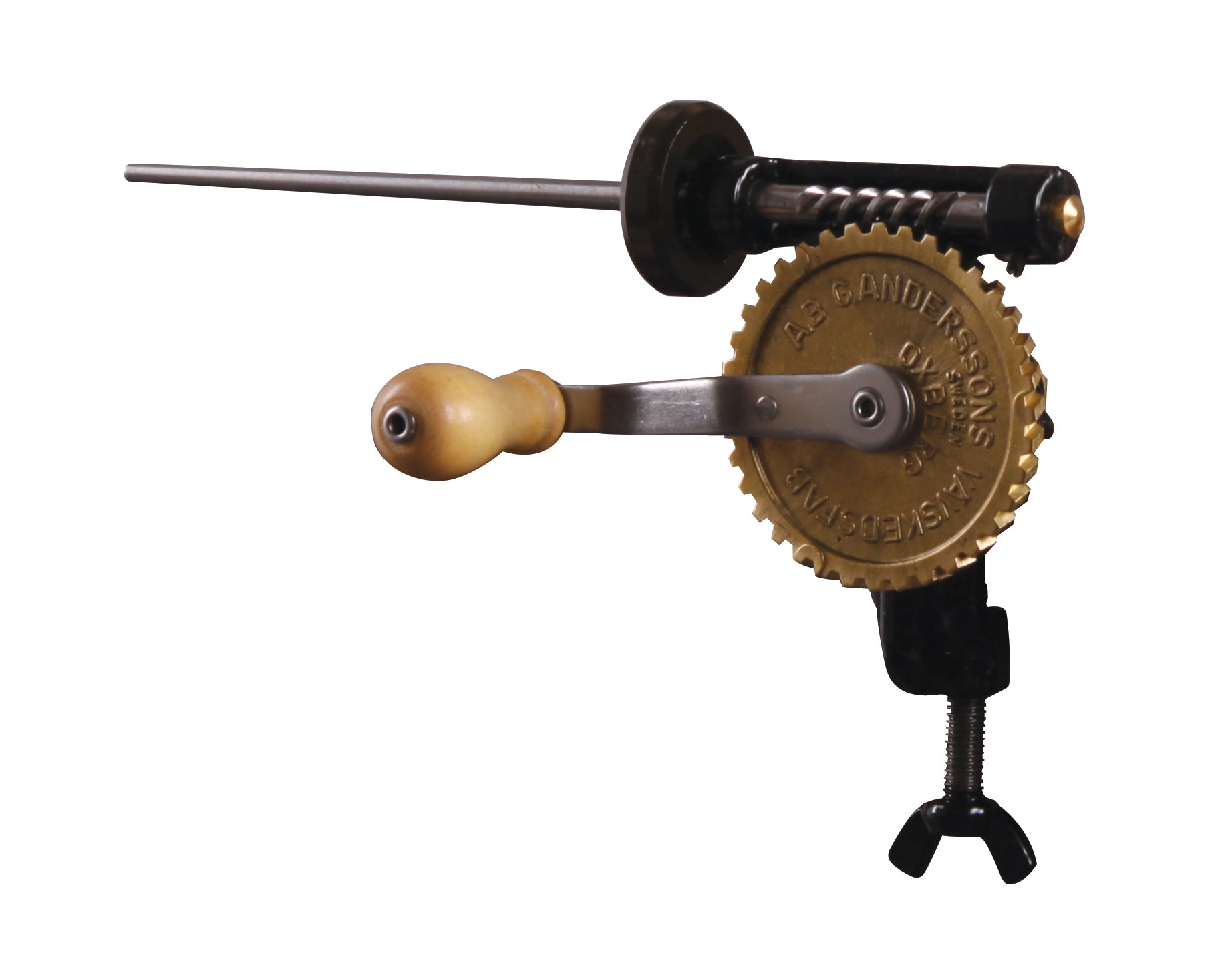 Metal bobbin winder with handle and table clamp. Includes one nylon weaving bobbin.